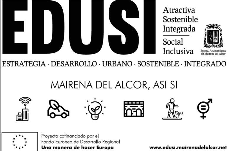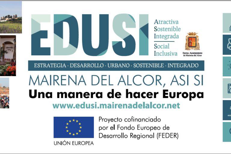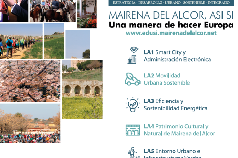 Descripción: Valla publicitaria de 8×3 m con impresión a color que presenta las líneas de actuación de la Estrategia de Desarrollo Urbano Sostenible e Integrado «Mairena…